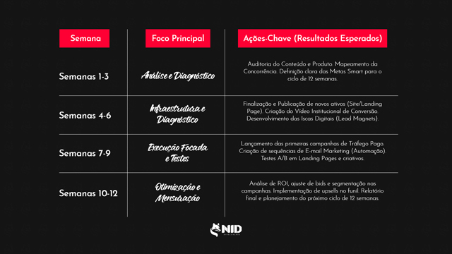 Para aplicar o princípio do “1 Ano em 12 Semanas” ao seu marketing, sugerimos um ciclo de 3 meses focado em resultados tangíveis. Este plano garante que você saia do planejamento para a máquina de vendas sem desvios: